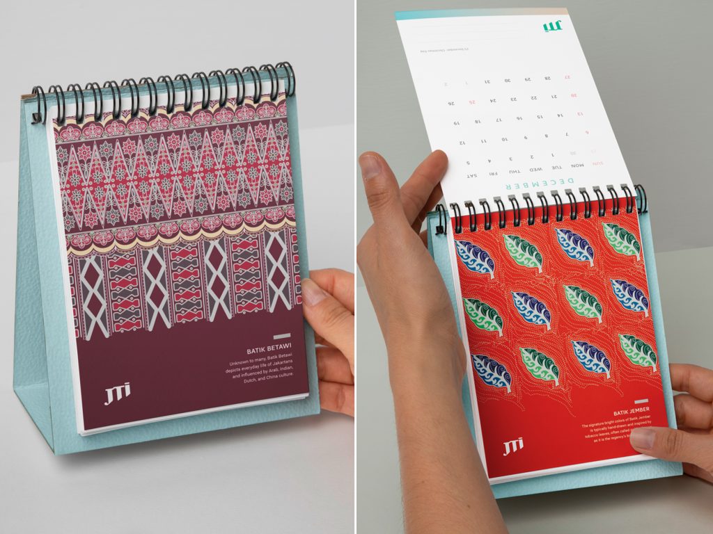 The visual concept is built around Nusantara textiles, using traditional Indonesian fabrics as the primary artwork to represent diversity, craftsmanship, and heritage. Each month highlights distinctive textile patterns, reinterpreted through a modern visual composition to align with JTI’s global brand standards.